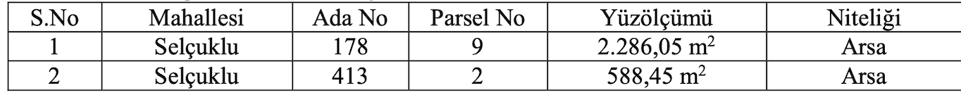 Belediye Meclisimizin 07.06.2024 tarih ve 06-67 sayılı kararı ve Belediye Encümenimizin 06.08.2024 tarih ve 26 sayılı kararı ile Belediyemize ait İlçemiz Selçuklu Mahallesindeki 178 ada 9 parsel nolu taşınmaz ile 413 ada 2 parsel nolu taşınmaz 2886 sayılı Devlet İhale Kanunu’nun 45. maddesine göre açık ihale usulü ile satılmak üzere ihale edilecektir.