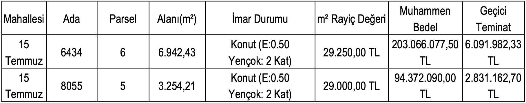 Söz konusu arsaların muhammen bedelleri 203 milyon 66 bin 77,50 TL ve 94 milyon 372 bin 90 TL olarak belirtilirken, geçici teminat bedelleri ise 6 milyon 91 bin 982,33 TL ve 2 milyon 831 bin 162,70 TL olarak belirtildi.
