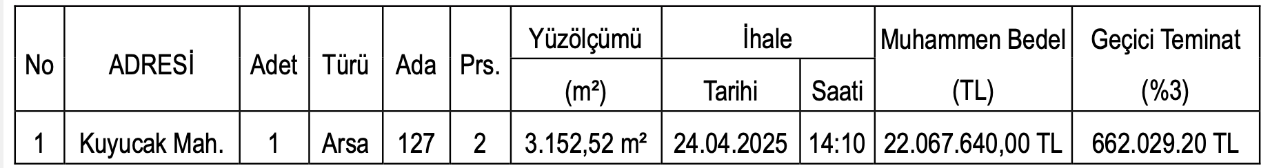 Kuyucak Mahallesi’nde yer alan arsanın satış ihalesi 24 Nisan 2025 tarihinde saat 14.20’de belediye encümeninin huzurunda belediye encümen salonunda yapılacak.