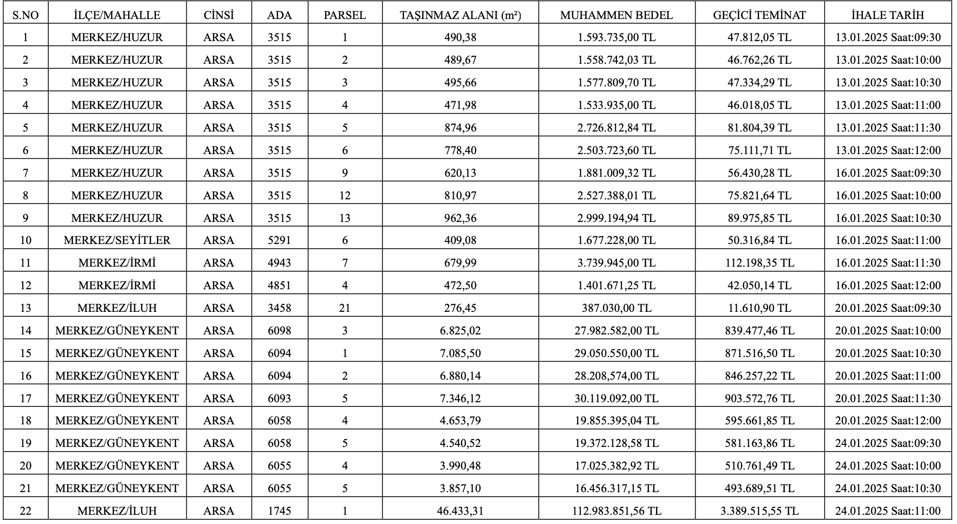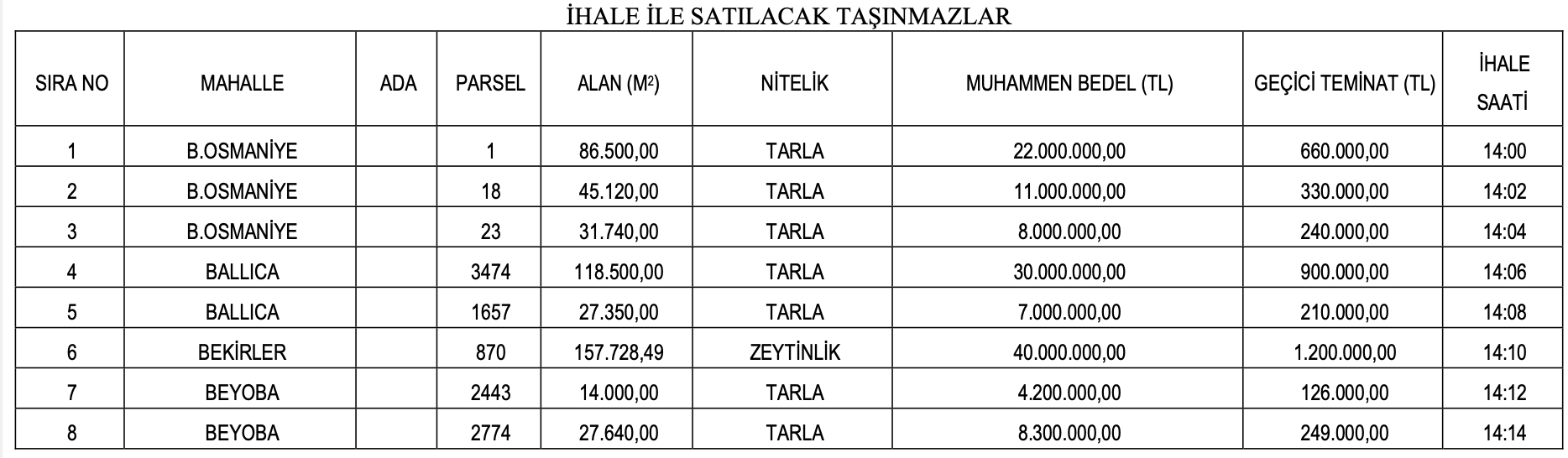 İhale suretiyle satılacak olan arsaların pafta, ada, parsel numaraları, metrekareleri, muhammen bedelleri, geçici teminatları ile ihale saatleri aşağıda liste halinde belirtilmiştir.
