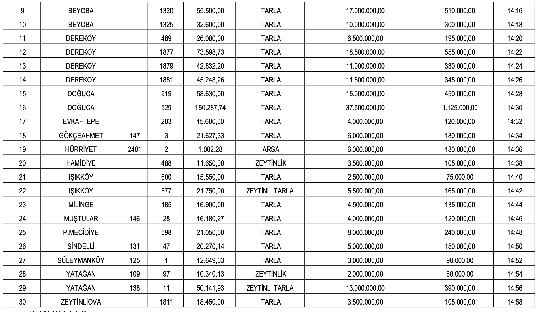 Muhammen bedellerin 387 bin 30 TL ile 112 milyon 983 bin 851,56 TL arasında farklılık gösterdiği arsaların geçici teminat bedelleri ise 11 bin 610,90 TL ile 3 milyon 389 bin 515,55 TL arasında farklılık gösteriyor.