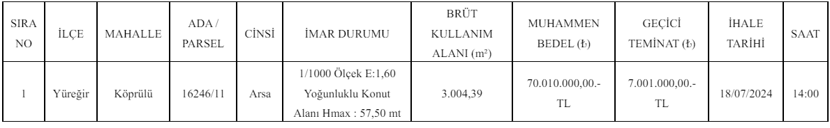 Yüreğir Belediyesi tarafından satışa çıkarılan ve Adana'da yer alan konut imarlı arsanın muhammen bedeli 70 milyon 10 bin TL, geçici teminat bedeli ise 7 milyon TL olarak açıklandı.