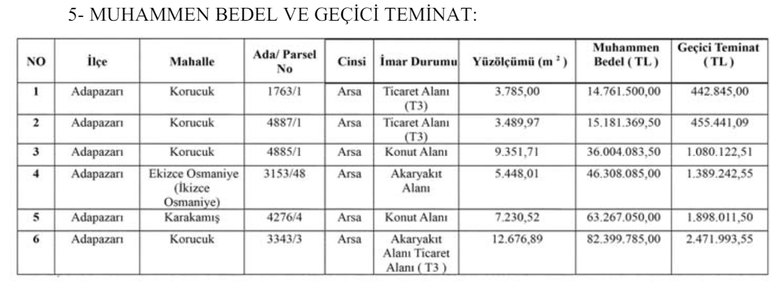 Adapazarı Belediyesi tarafından satışa çıkarılan ve Sakarya Adapazarı'nda yer alan ticaret, akaryakıt, konut imarlı arsaların satış bedelleri 14 milyon 761 bin 500 TL ile 82 milyon 399 bin 785 TL arasında değişirken, geçici teminat bedelleri de 2 milyon 471 bin 993 TL ile 442 bin 845 TL