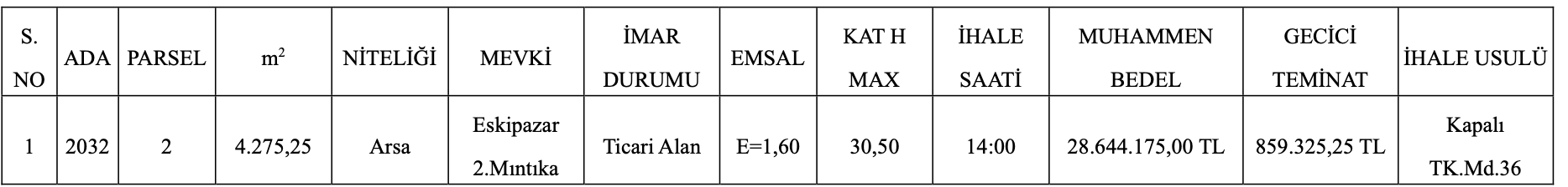 Eskipazar 2. Mıntıka’da yer alan arsanın muhammen bedeli 28 milyon 644 bin 175 TL olarak, geçici teminat bedeli ise 859 bin 325,25 TL olarak açıklandı.