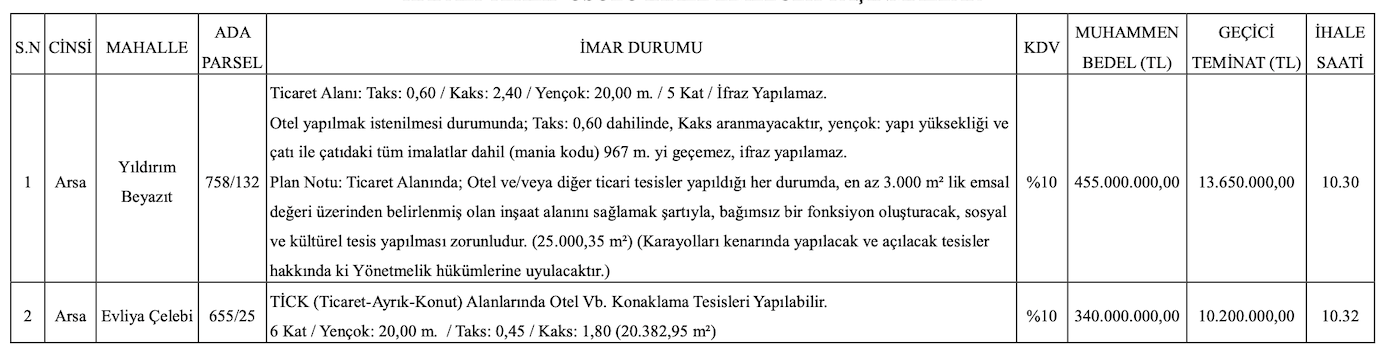 Muhammen bedelleri 455 milyon TL ve 340 milyon TL olarak açıklanan arsaların muhammen bedelleri ise 13 milyon 650 bin TL ve 10 milyon 200 bin TL olarak açıklandı.