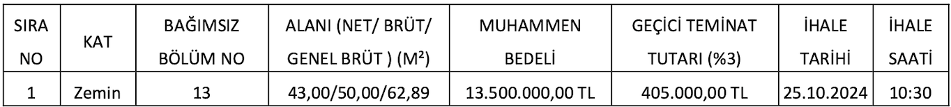 Söz konusu işin Bağımsız Bölüm No, Alanı, Muhammen Bedeli, Geçici Teminat Tutarı, İhale tarih ve saati aşağıdaki tabloda belirtilmiştir.