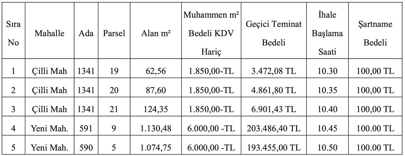 Mah. 591 ada 9 parsel -Yeni Mah. 590 ada 5 parselde bulunan arsalar 2886 sayılı DİK. nun 45. maddesi gereğince açık teklif (açık artırma) sözleşme tarihinden itibaren satışı yapılacak olup, arsaların m2 muhammen bedelleri ve geçici teminat bedelleri aşağıya çıkarılmıştır.(Çilli Mah. arsaları yapı yapmaya elverişli değildir)