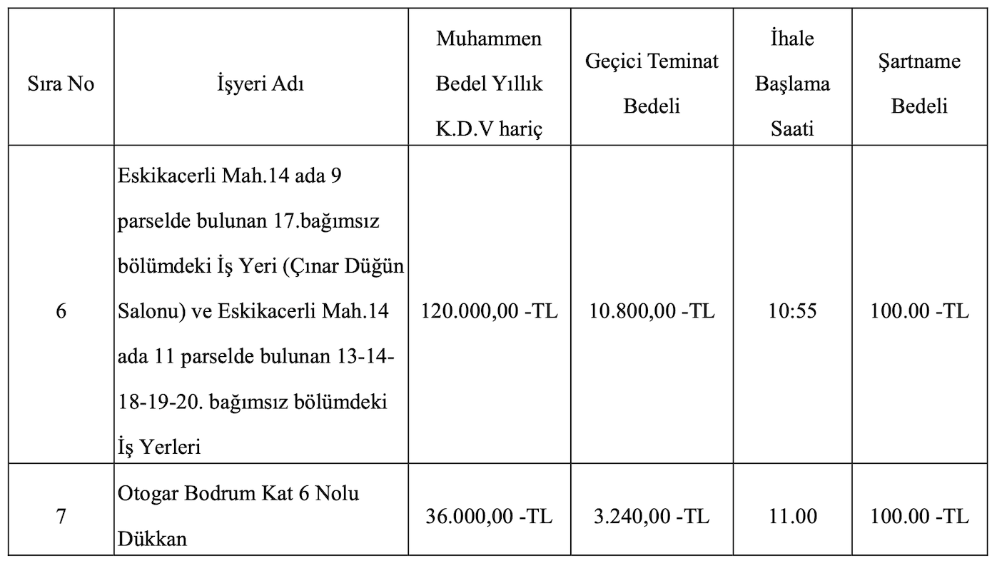 Kiraya verilecek iş yerlerinin ise yıllık bedelleri 120 bin TL ve 36 bin TL olarak açıklanırken, geçici teminat bedelleri ise 10 bin 800 TL ve 3 bin 240 TL olarak açıklandı.