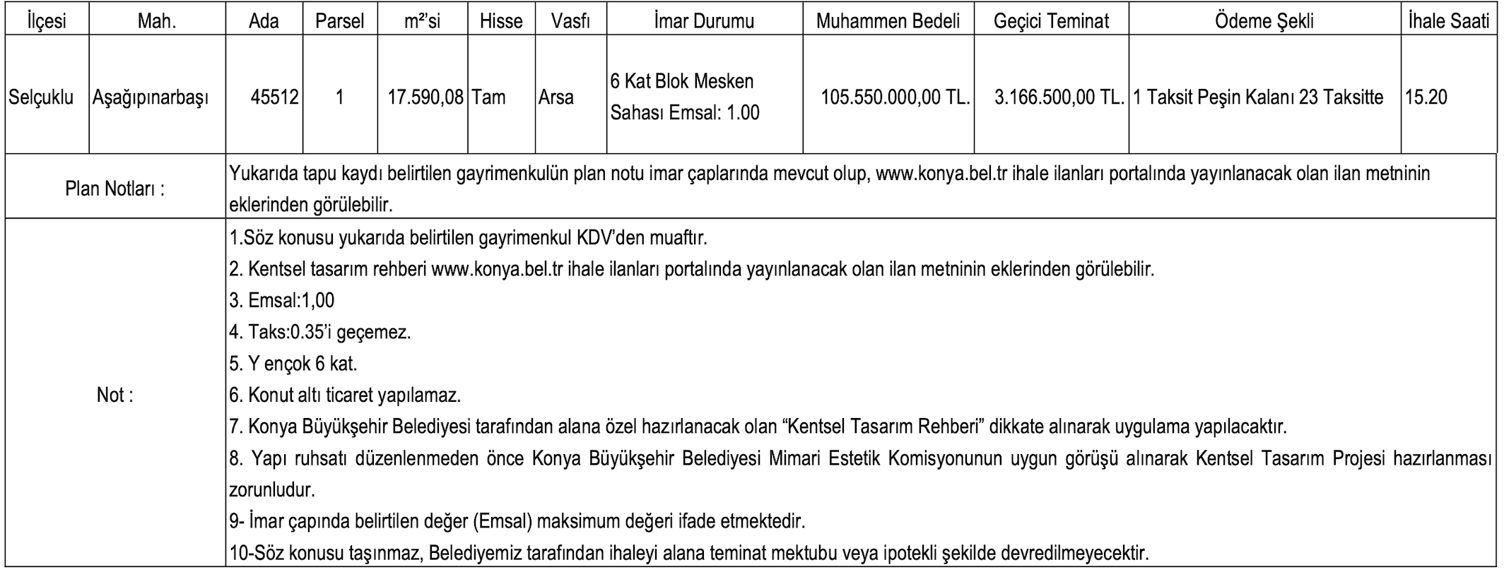 Konya Büyükşehir Belediye Başkanlığı tarafından satışa çıkarılan ve Konya Selçuklu’da yer alan arsa 17 bin 590 metrekare alana sahip.
