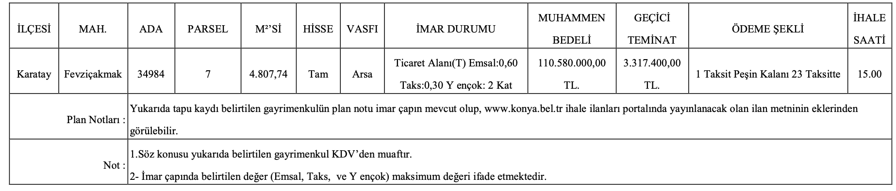 Konya Karatay’da yer alan ticaret alanı imarlı arsanın muhammen bedeli 110 milyon 580 bin TL olarak açıklanırken, geçici teminat bedeli ise 3 milyon 317 bin 400 TL olarak açıklandı. Fevziçakmak Mahallesi’nde yer alan arsa 4 bin 807,74 metrekare yüz ölçümüne sahip.