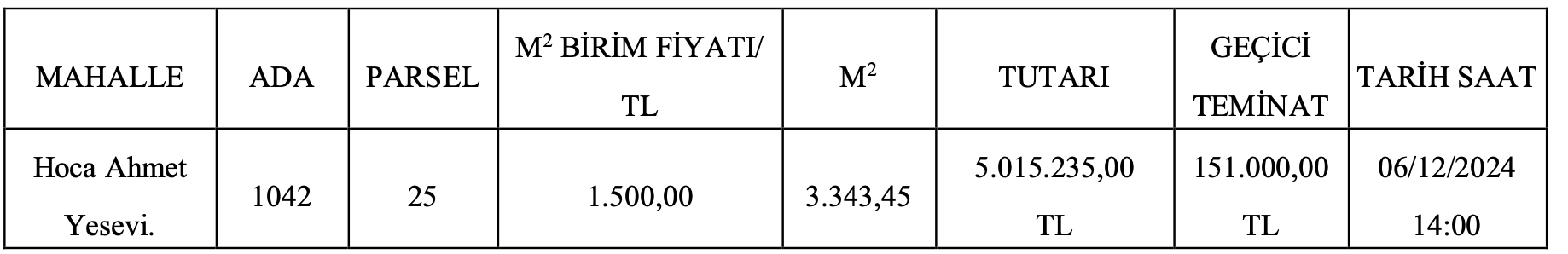 Muhammen bedeli 5 milyon 15 bin 235 TL olarak açıklanan arsanı geçici teminat bedeli 151 bin TL olarak açıklandı.