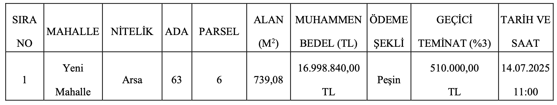 739,08 metrekare alana sahip arsanın satış ihalesi 14 Temmuz 2025 tarihinde saat 11.00’de Başkanlık Odasında Encümen huzurunda yapılacak.