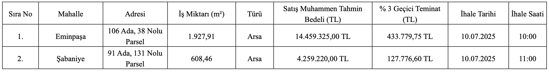 Konya ve Van’da yer alan 2 adet arsa satışa çıkarıldı. Arsaların satış ihalelerinin 10 Temmuz ve 14 Temmuz’da yapılacağı belirtildi.