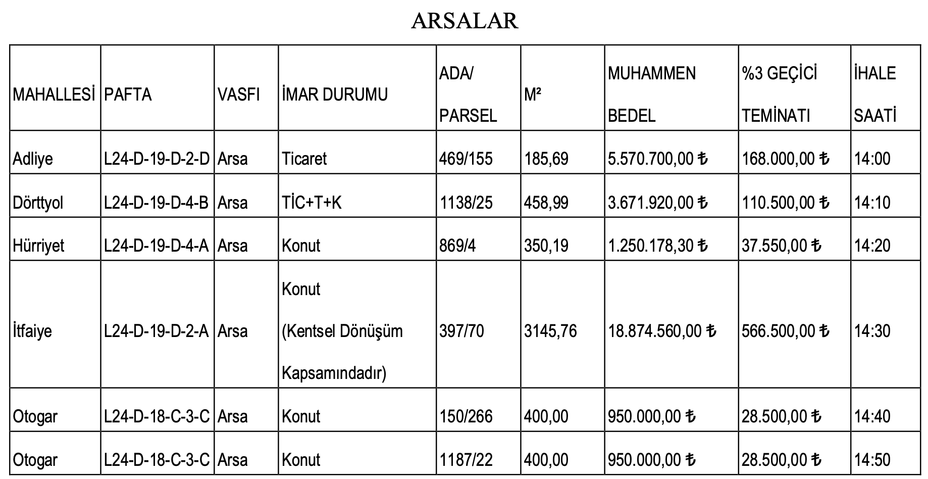 Tokat Belediye Başkanlığı ve Dinar Belediye Başkanlığı, Tokat ve Afyonkarahisar’da yer alan yedi adet arsayı satışa çıkardı. İmarlı arsaların hem muhammen bedelleri hem de ihale tarihleri tek tek açıklandı.