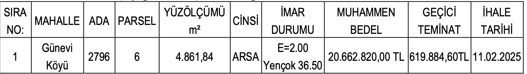 Madde 1: Aşağıda tapu kaydı ve nitelikleri belirtilen Tokat Merkez Günevi Köyü Ada 2796, 6 parsel ‘de kayıtlı 6.697,67m² miktarlı İmar Planında E=2.00 Yençok =36.50 Konut alanında kalan taşınmazdaki Belediyemiz adına kayıtlı bulunan (4.861,84m²) hisse olmak üzere mülkiyeti Belediyemize ait taşınmazın 2886 sayılı Devlet İhale Kanununun 35/a. Maddesi gereği kapalı teklif usulü ve şartname esasları dahilinde satış ihalesi 11.02.2025 tarih ve Salı günü saat 14 :00 ‘da Belediyemiz Encümen huzurunda Encümen odasında yapılacaktır.