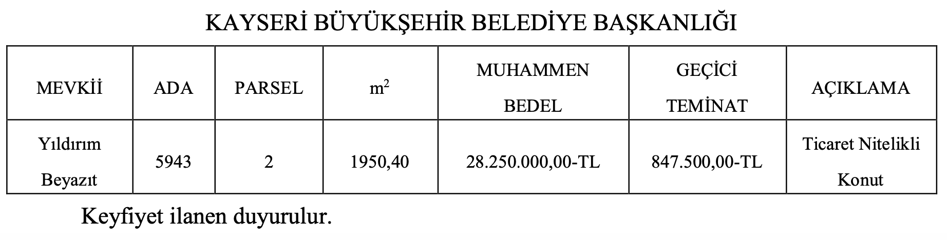 Mülkiyeti Belediyemize ait olup, Melikgazi İlçesi Yıldırım Beyazıt Mahallesi 5943 ada 2 parselde bulunan Ticaret Nitelikli Konut alanı arsası 2886 sayılı Devlet İhale Kanununun 37. maddesi gereğince yapılacak “Kapalı Teklif Usulü” ihale ile satılacaktır.