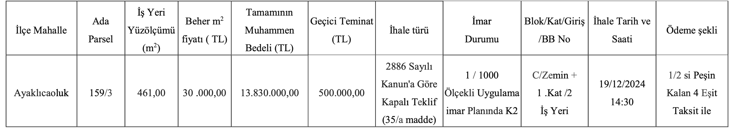 Ayaklıcaoluk mahallesinde yer alan iş yerinin satış ihalesi 19 Aralık 2024 tarihinde saat 14.30’da Dulkadiroğlu Belediyesi Encümen salonunda yapılacak.
