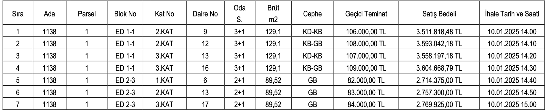 3 oda 1 salon şeklindeki konutların satış bedelleri 2 milyon 714 bin 375 TL ve 3 milyon 604 bin 668,70 TL arasında değişirken, geçici teminat bedelleri ise 82 bin TL ile 108 milyon TL arasında değişiyor.