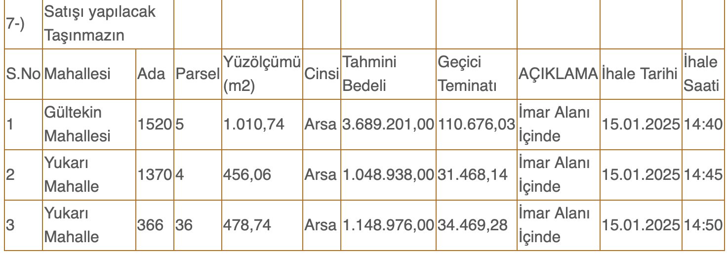 İmar alanı içindeki arsaların satış ihalesi 15 Ocak 2025 tarihinde saat14.40 ile 14.50 arasında yapılacak. Satışa çıkarılan arsalar Gültekin ve Yukarı mahallesinde yer alıyor.