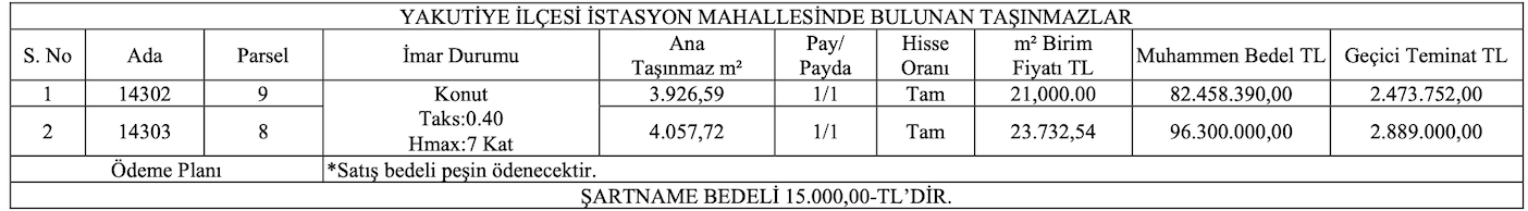 Konut imarlı arsaların muhammen bedelleri 82 milyon 458 bin 390 TL ve 96 milyon 300 bin TL şeklinde belirtilirken, geçici teminat bedelleri de 2 milyon 473 bin 752 TL ve 2 milyon 889 bin TL olarak açıklandı.