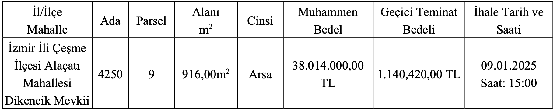 İzmir Çeşme’de yer alan 916 metrekare arsanın muhammen bedeli 38 milyon 14 bin TL, geçici teminat bedeli ise 1 milyon 140 bin 420 TL olarak açıklandı.