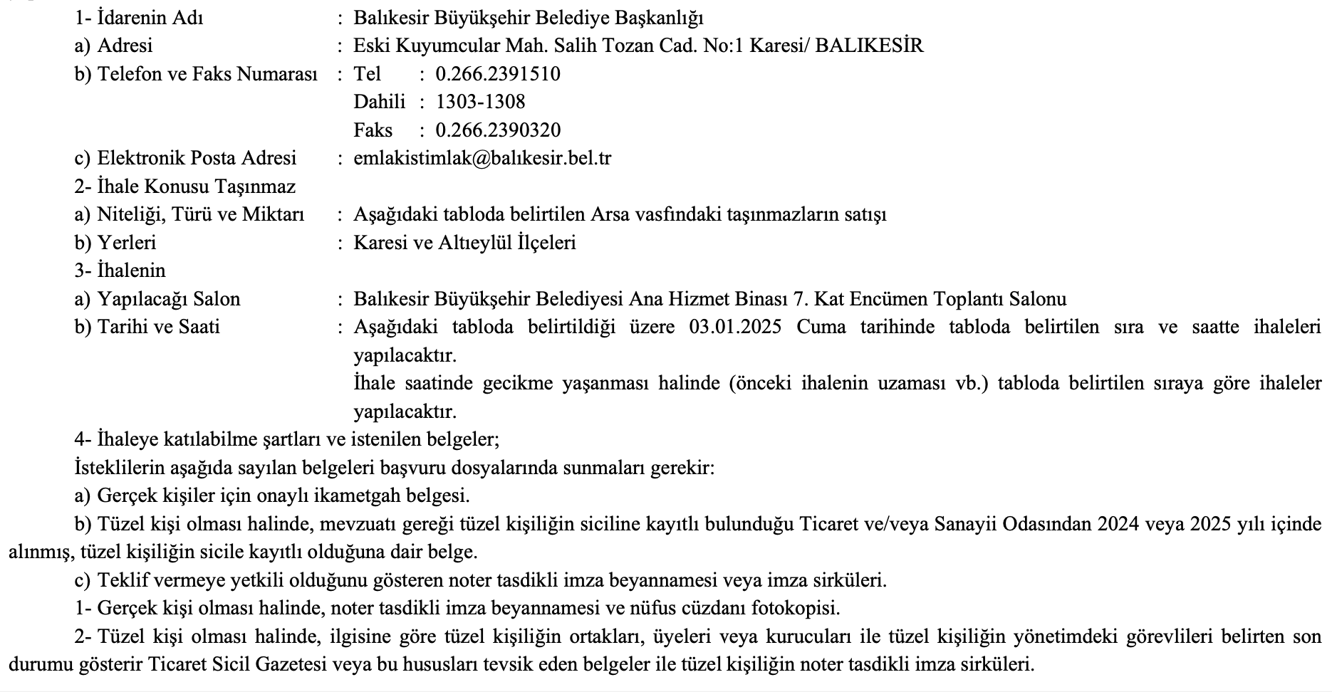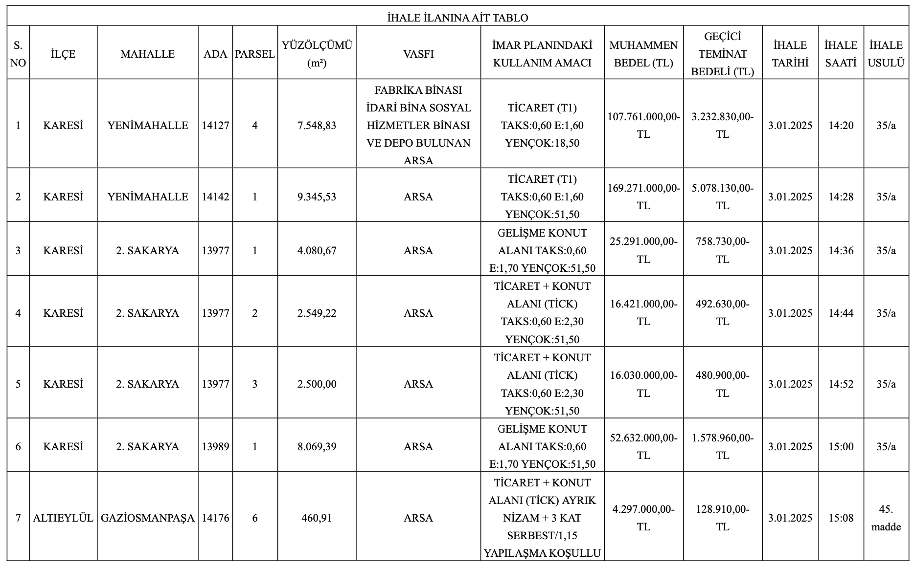 Arsaların satış ihaleleri 3 Ocak 2025 tarihinde saat 14.20 ile 17.16 arasında Balıkesir Büyükşehir Belediyesi Ana Hizmet Binası 7. Kat Encümen Toplantı Salonu’nda gerçekleştirilecek.