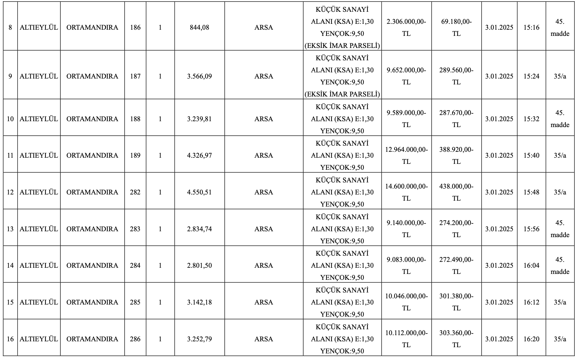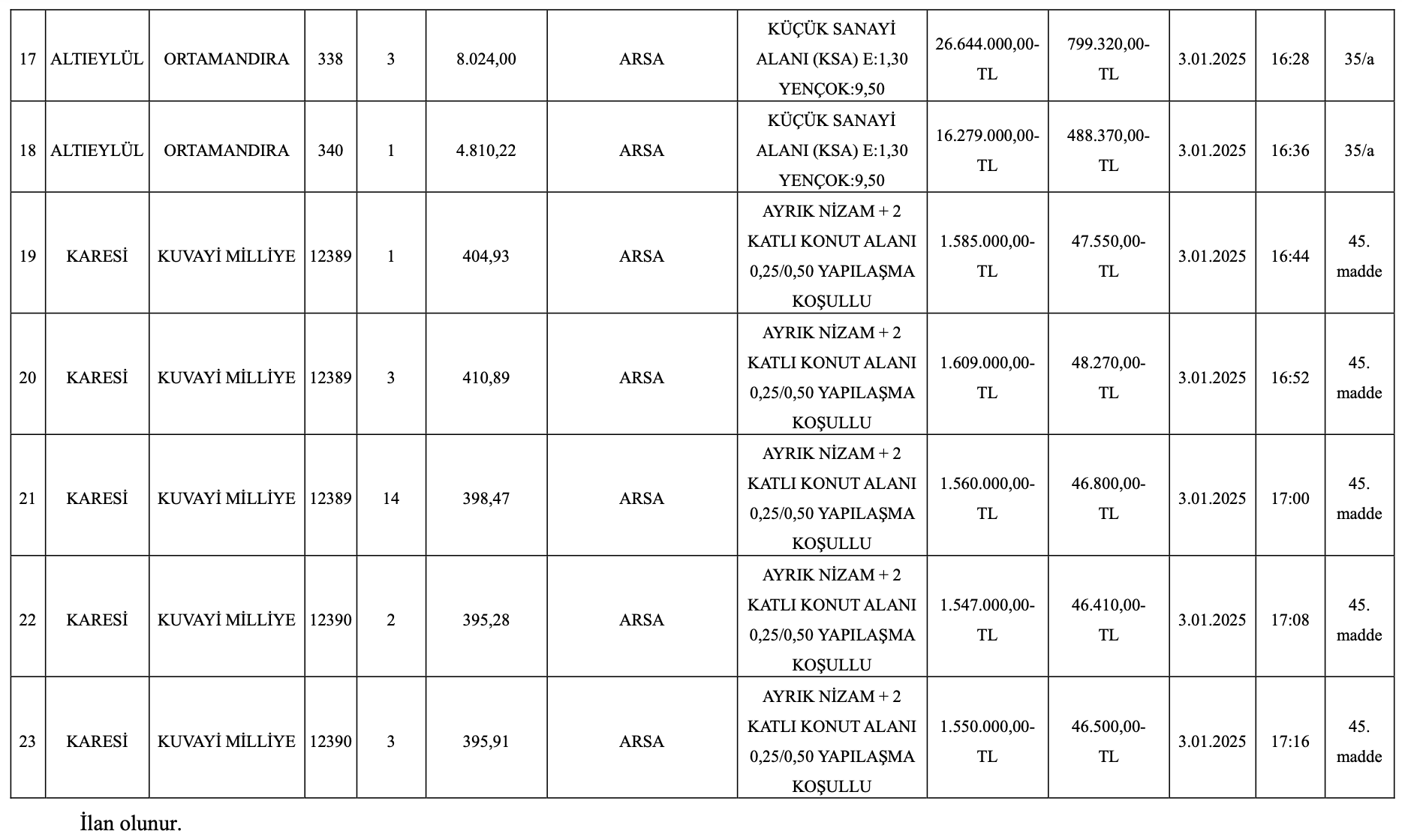 Balıkesir Karesi ve Altıeylül’de yer alan arsaların yüz ölçümleri 395,91 metrekare ile 9 bin 345,53 metrekare arasında değişiyor.