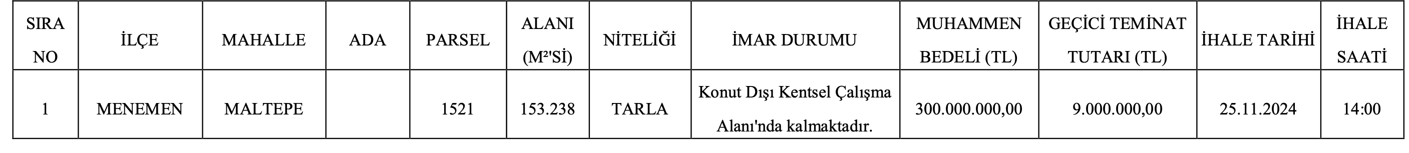 İzmir Menemen Maltepe Mahallesi’nde yer alan arazinin yüz ölçümü 153 bin 238 metrekare olarak açıklandı. Muhammen bedeli 300 milyon TL olarak belirtilen arazinin geçici teminat bedeli ise 9 milyon TL olarak belirildi.