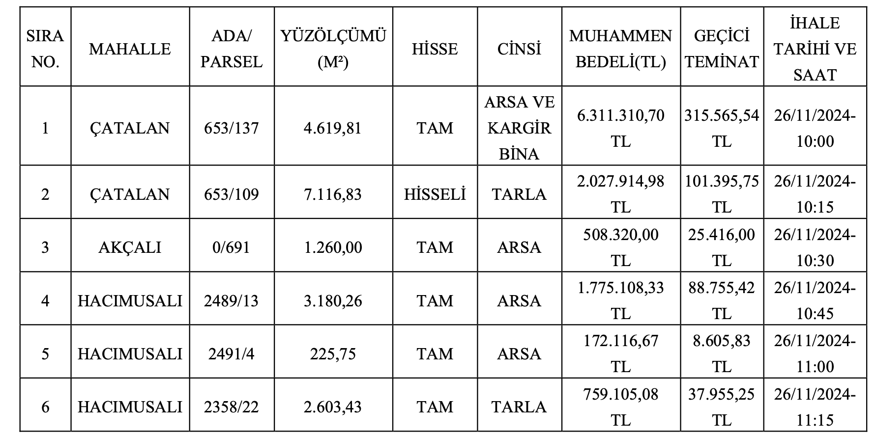 Adana Çatalan, Akçalı ve Hacımusalı’da yer alan kargir bina, arazi ve arsaların yüz ölçümleri 225,75 metrekare ile 7 bin 116,83 metrekare arasında değişiyor.