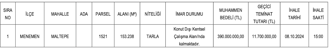 Menemen Belediye Başkanlığı tarafından satışa çıkarılan arazinin muhammen bedeli 390 milyon TL olarak açıklandı. Arazinin satış ihalesi 8 Ekim 2024 tarihinde gerçekleştirilecek.
