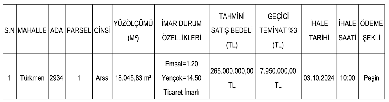 Türkmen mahallesinde yer alan ve ticaret imarlı arsanın satış bedeli 265 milyon TL, geçici teminat bedeli ise 7 milyon 950 bin TL olarak açıklandı.