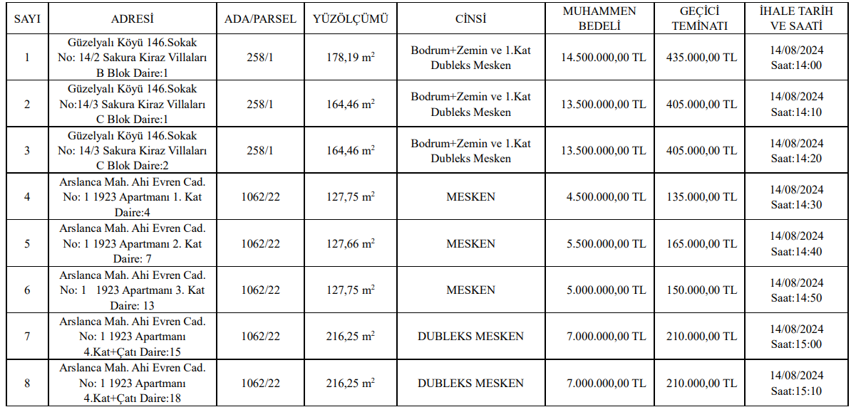 Alanları 127,66 metrekare ile 216,25 metrekare arasında değişen konutların satış ihalesi 14 Ağustos tarihinde yapılacak.