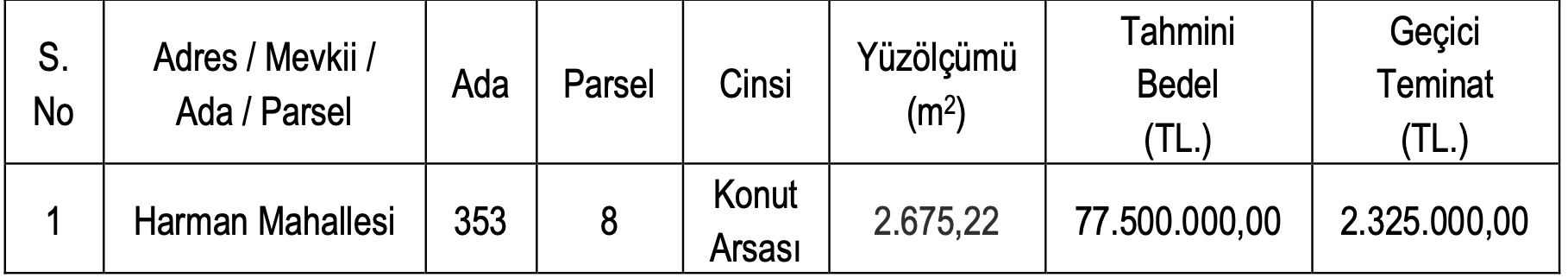 Satışa çıkarılan arsanın tahmini bedeli 77 milyon 500 bin TL olarak açıklanırken, geçici teminat bedeli ise 2 milyon 325 bin TL olarak açıklandı.