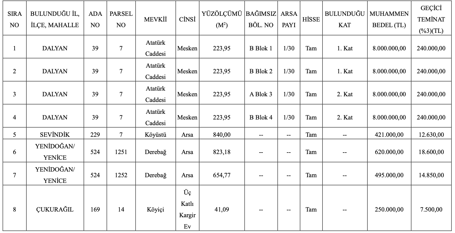 Mülkiyeti Belediyemize ait, aşağıda yazılı 8 (Sekiz) adet gayrimenkul, 2886 sayılı Kanunun 45. maddesi hükmü gereğince açık artırma usulü ile