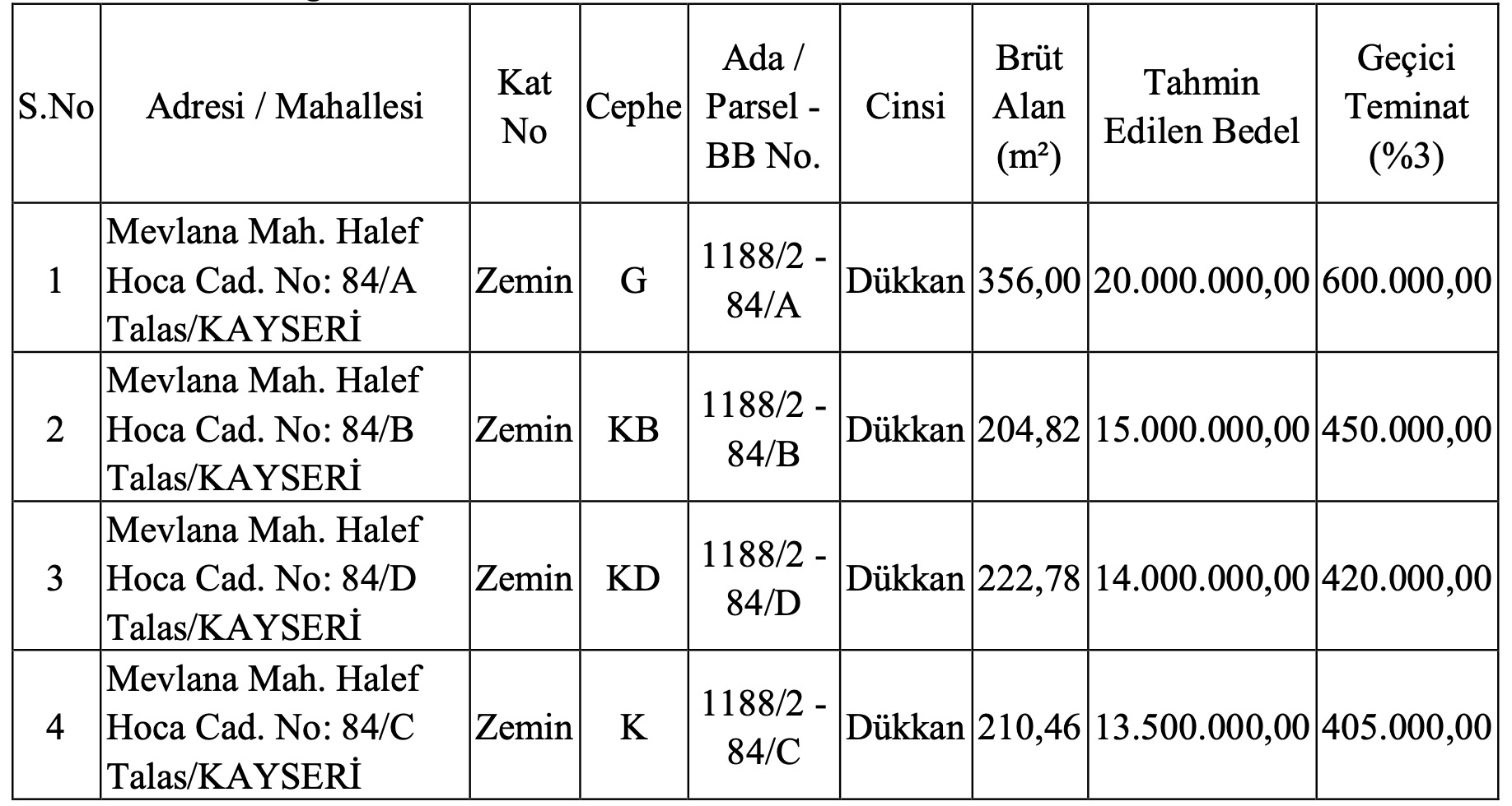 Kayseri’de yer alan dört adet dükkanın yüz ölçümleri 204,82 metrekare ile 356 metrekare arasında değişiyor.