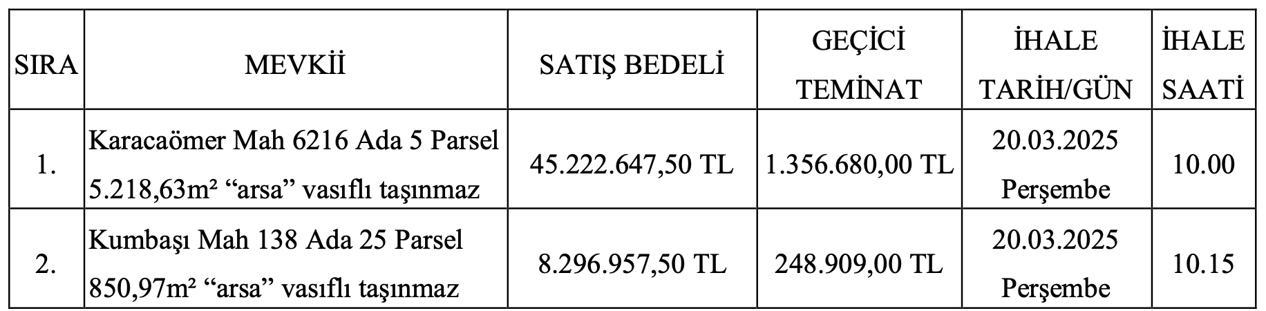 Muhammen bedelleri 45 milyon 222 bin 647,50 TL ve 8 milyon 296 bin 957,50 TL şeklinde belirtilen arsaların geçici teminat bedelleri ise 1 milyon 356 bin 680 TL ve 248 bin 909 TL olarak belirtildi.