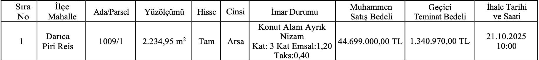 Kocaeli Darıca’da yer alan arsa 2 bin 234,95 metrekare olarak açıklandı. Konut alanı imarlı arsanın muhammen bedeli 44 milyon 699 bin TL şeklinde belirtilirken, geçici teminat bedeli ise 1 milyon 340 bin 970 TL şeklinde belirtildi.