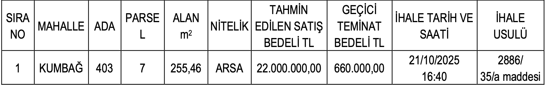 İhale, 21.10.2025 tarihine tesadüf eden Salı günü gerçekleştirilecektir. Satılacak