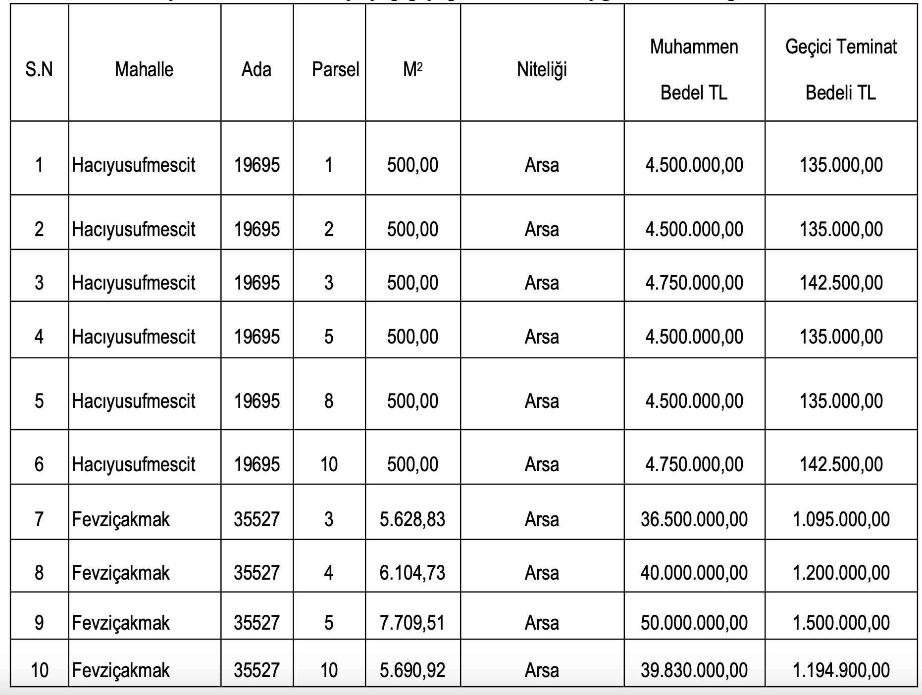 Satışa çıkarılan arsaların muhammen bedelleri 4 milyon 500 bin TL ile 50 milyon TL arasında, geçici teminat bedelleri ise 135 bin TL ile 1 milyon 500 bin TL arasında farklılık gösteriyor.