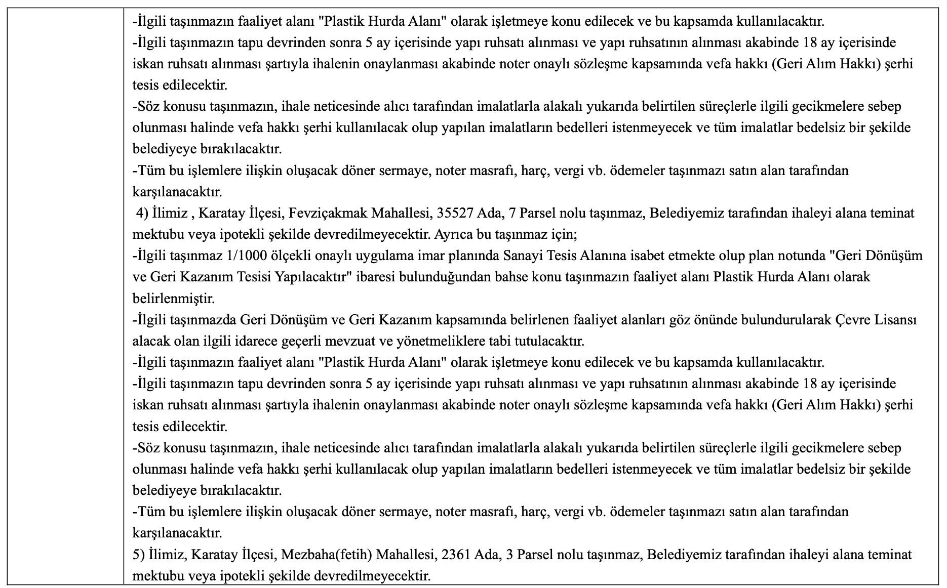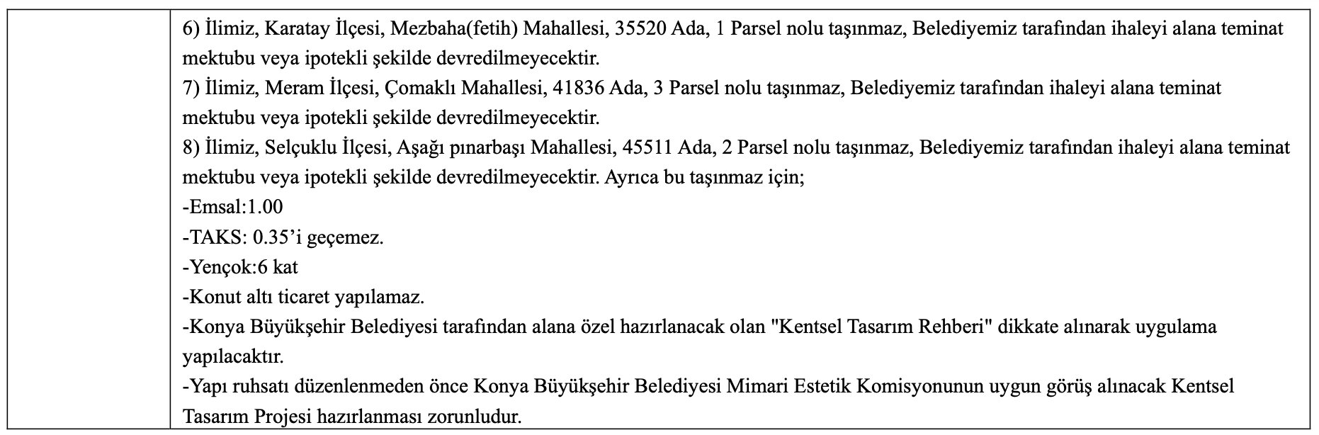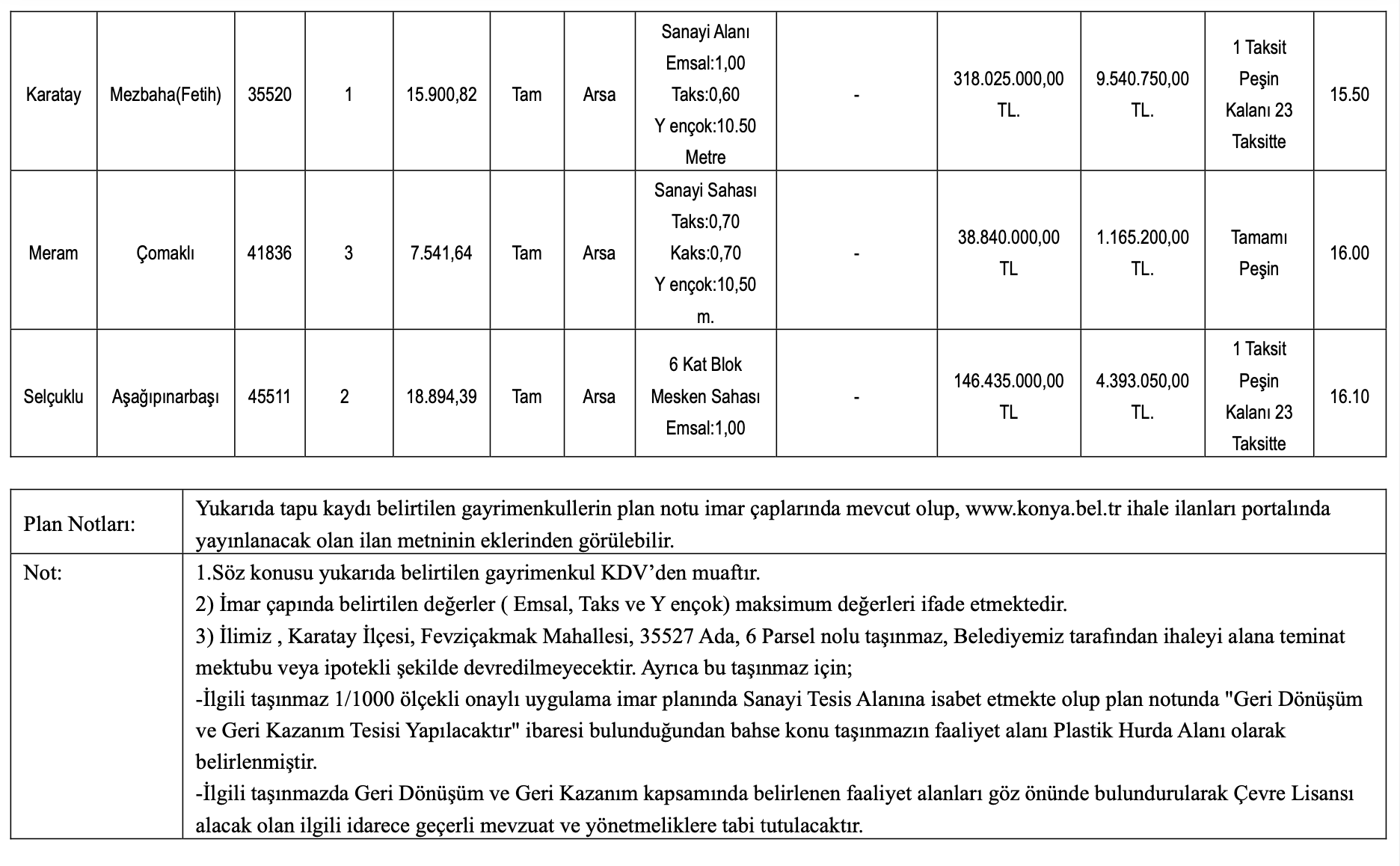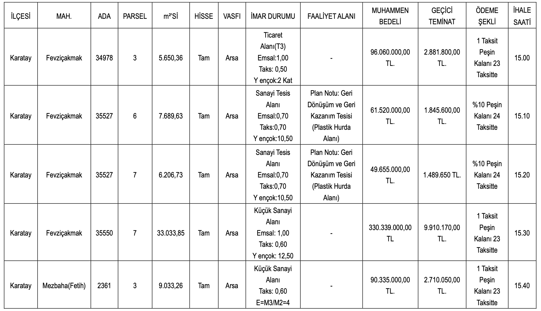 Konya’da yer alan arsaların yüz ölçümleri 5 bin 650,36 metrekare ile 33 bin 33,85 metrekare arasında değişiyor. Söz konusu arsaları ticaret, sanayi mesken imarlı olarak belirtildi.