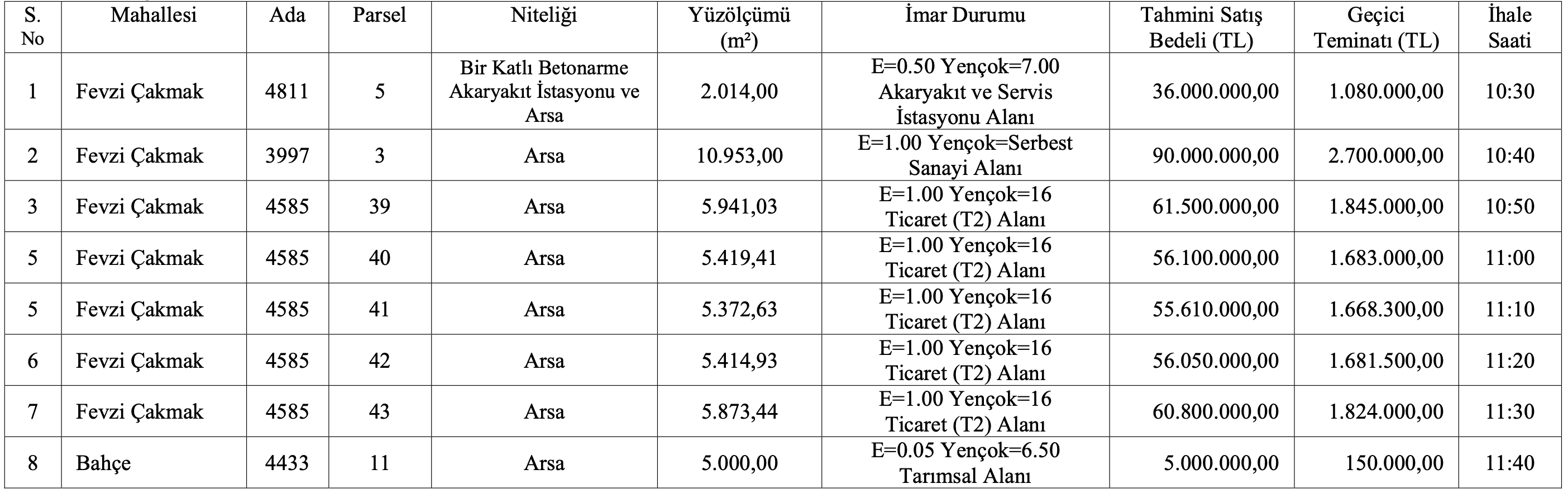 Madde 1-) Mülkiyeti Tarsus Belediyesine ait olup, madde 2’de belirtilen taşınmazlar 16/04/2025 tarihinde yapılacak ihale ile satılacaktır.