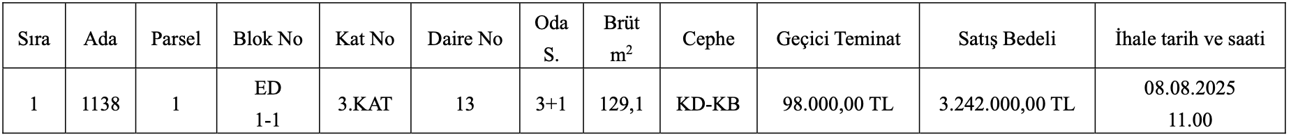2- İhale 08.08.2025 Cuma günü aşağıda tabloda belirtilen saatlerde Belediye Encümen toplantı salonunda yapılacaktır.
