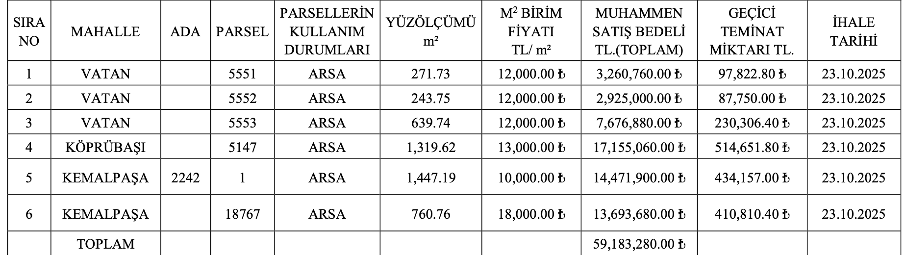 Arsaların satış ihalesi 23 Ekim 2025 tarihinde gerçekleştirilecek.