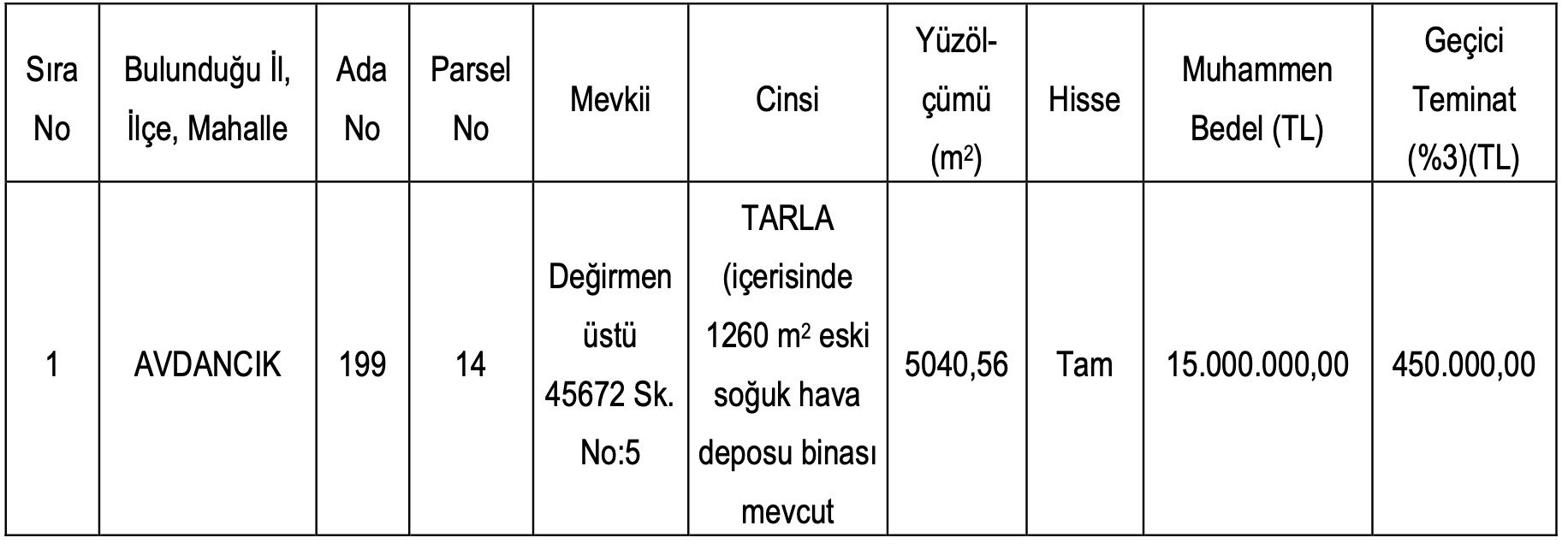 4-Taşınmazın muhammen satış bedeli ve geçici teminat miktarı, yukarıda tabloda gösterilmiştir. İstekliler söz konusu taşınmazın satış ihalesine katılabilmek için muhammen bedelinin en az %3’ü (yüzde üç) nispetinde, geçici teminatı nakden veya teminat mektubu ile yatırmak zorundadır.