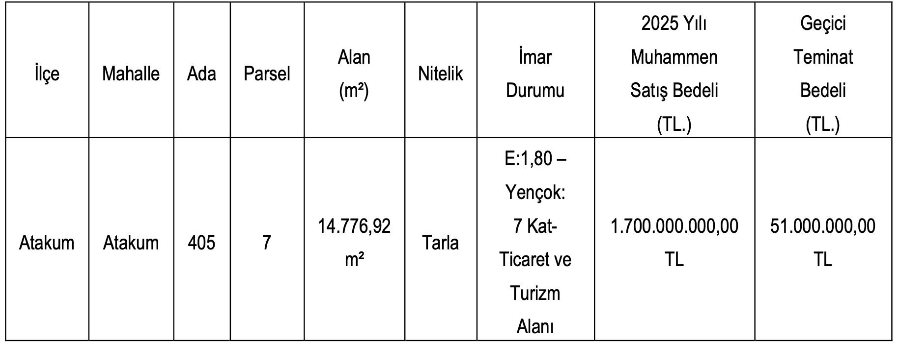 Samsun Atakum’da yer alan arazi 14 bin 776,92 metrekare alana sahip. Ticaret ve turizm alanı imarlı arazinin muhammen bedeli 1 milyon 700 bin TL şeklinde açıklanırken, geçici teminat bedeli ise 51 milyon TL olarak açıklandı.