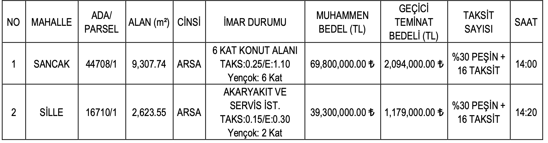 Konya Selçuklu’da yer alan iki adet arsa konut, akaryakıt ve servis istasyonu imarlı olarak belirtildi. Söz konusu arsaların muhammen bedelleri 69 milyon 800 bin TL ve 39 milyon 300 bin TL olarak açıklanırken, geçici teminat bedelleri ise 2 milyon 94 bin TL ve 1 milyon 179 bin TL olarak açıklandı.
