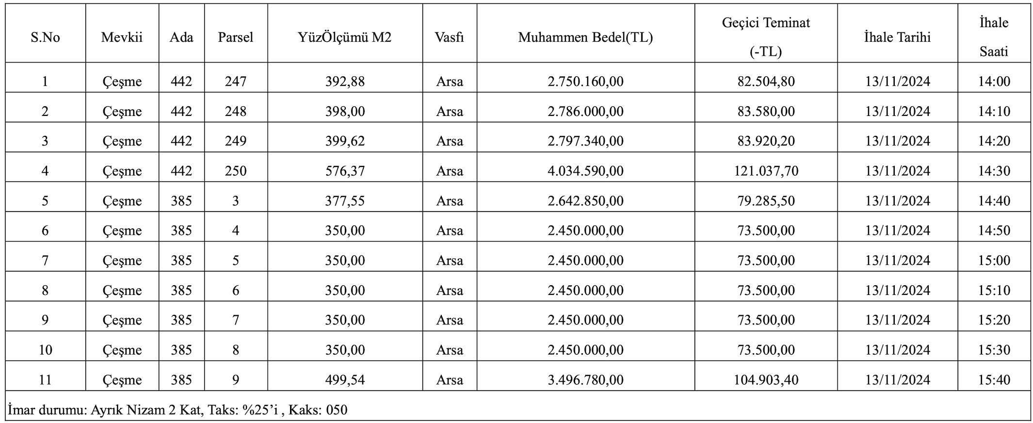 Çeşme mevkiinde yer alan arsaların satış ihalesi 13 Kasım 2024 tarihinde saat 14.00 ile 15.40 arasında yapılacak.