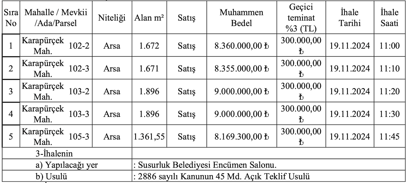 Arsaların satış ihaleleri 19 Kasım 2024 tarihinde saat 11.00 ile 11.45 arasında Susuluk Belediyesi Encümen Salonu’nda gerçekleştirilecek.