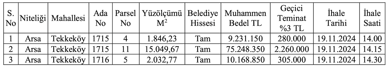 Arsaların satış ihaleleri 19 Kasım 2024 tarihinde saat 14.00 ile 14.30 arasında Tekkeköy Belediyesi Meclis Salonunda Encümen huzurunda yapılacak.