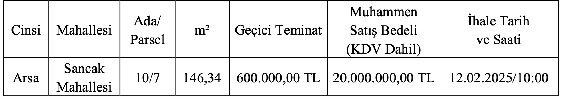 Mülkiyeti Belediyemize ait, İlçemizin Sancak Mahallesi 10 ada 7 numaralı 146,34 m² parsel, üzerindeki karkas betonarme bina ile birlikte, 2886 sayılı Yasanın 45. maddesi hükmüne göre açık teklif usuluyle artırım şeklinde ihale yolu ile satılacaktır.
